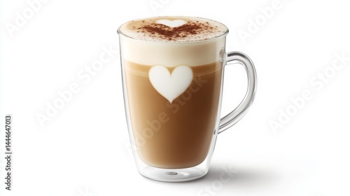 Creamy latte with heart design served in a clear mug at a cozy cafe in the afternoon