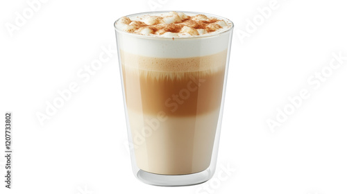 Creamy Layered Coffee Beverage with Frothy Topping and Cinnamon Dusting Served in a Clear Glass Against a Clean Background
