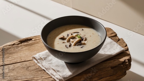 Creamy Mushroom Soup in a Dark Bowl on a Wooden Surface.