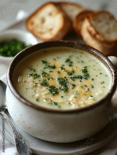 Creamy potato soup with cheddar cheese and parsley garnish served with toasted bread slices
