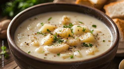 Creamy Scottish Cullen Skink Soup in Bowl with Fresh Herbs and Artisan Bread on Wooden Table