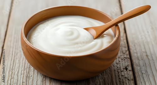 Creamy smooth yogurt in wooden bowl with spoon, a healthy and delicious breakfast or snack option, perfect for a balanced diet and lifestyle choice