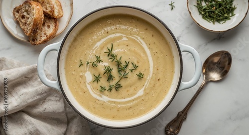 Creamy soup in white pot with bread slices, herbs, and spoon on a marble surface overhead shot