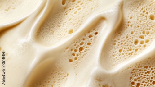 Creamy texture of freshly prepared dessert, showcasing swirling patterns and bubbles, with rich beige color, inviting an indulgent experience