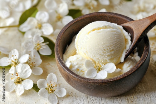 Creamy vanilla ice cream served in a rustic bowl garnished with delicate white blossoms on a soft textured backdrop