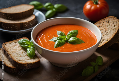 Creamy vegan tomato soup with fresh basil leaves in a bowl, accompanied by a slice of whole-grain bread on a dark background, ai.
