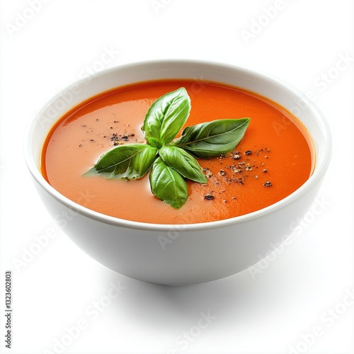 Creamy, vibrant orange tomato soup, garnished with fresh basil and pepper