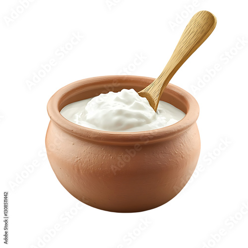 Creamy yogurt in a rustic terracotta bowl with a wooden spoon.