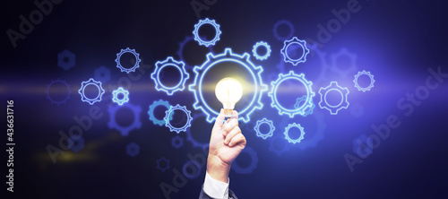 Creative and business idea concept with glowing light bulb in man hand and digital gears on abstract wallpaper.