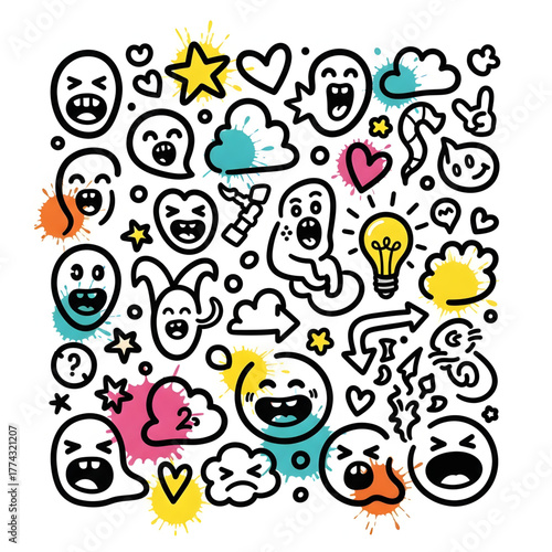 Creative cartoon doodle icons set with expressive splash face, hearts, stars, and idea bulbs for decor