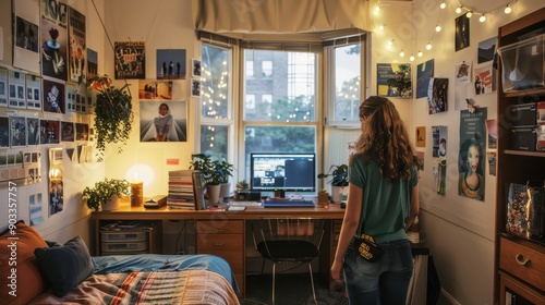 Creative Dorm Room Decoration: Student Adding Personal Touch with Photos and Posters for University Living Space