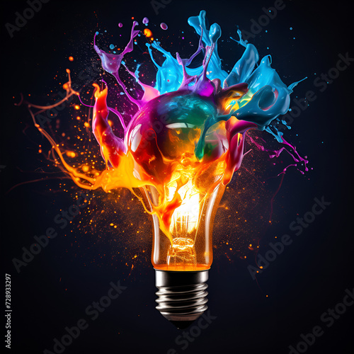 Creative light bulb explodes with colorful paint and splashes on a black background. Think differently creative idea concept