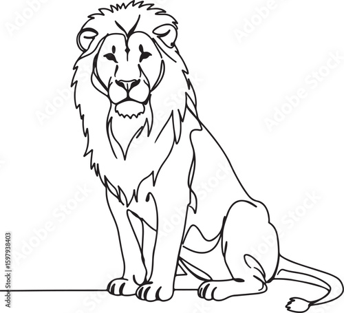 Creative line art of a lion sitting tall, drawn in one unbroken stroke, black and white minimalist vector drawing,
