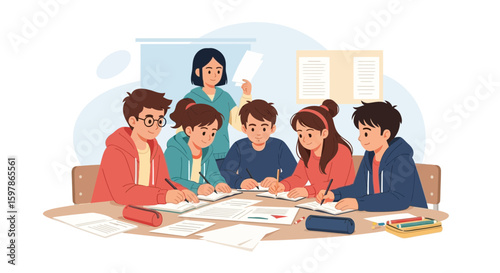 Creative Students Collaborate On Project In Classroom With Teacher Supervision