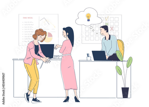 Creative workers in office. Man and women brainstorming. Colleagues and partners discuss proect. Idea and insight, solution of problem. Linear vector illustration isolated on white background