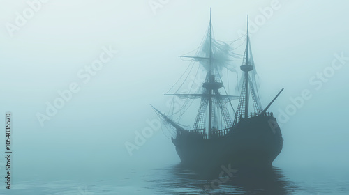 Creepy pirate ghost ship sailing through foggy waters, pirate, ghost, ship, spooky, haunted, abandoned, eerie, ocean, sea. Ghost Ship. Illustration