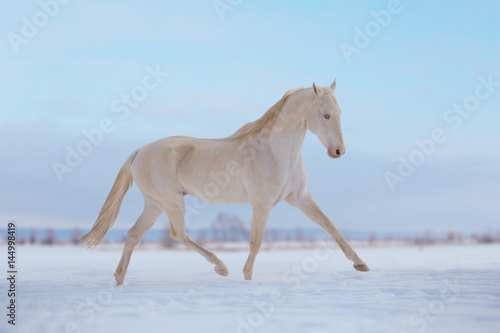 Cremello horse runs on snow in winter