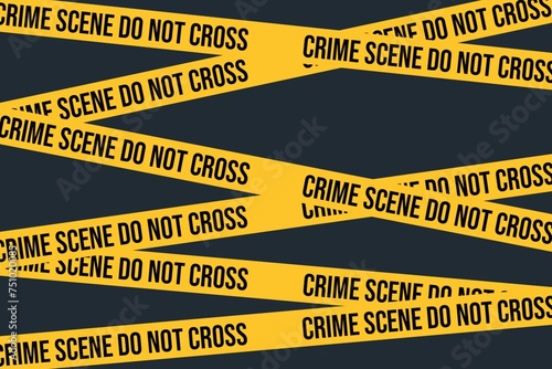 Crime scene yellow tape, police line Do Not Cross tape. Flat style illustration cartoon design on black background.