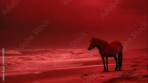 Crimson Coastal Equine A Solitary Horse Amidst a Red Tainted Beach Landscape Under a Dramatic Sky Creating a Dreamlike Scene