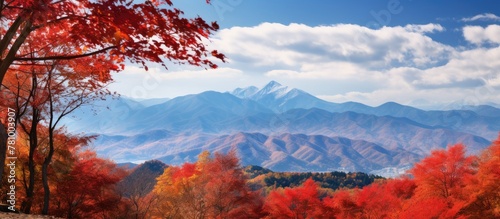 Crimson leaves adorn distant mountains where a few trees stand amidst the stunning autumn scenery