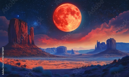 Crimson Moon Over a Serene Desert Landscape
