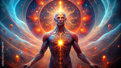 Crimson Radiance: Ethereal red light, glowing skin, mystical atmosphere, celestial connection