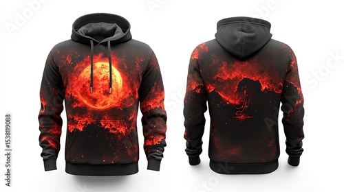 Crimson smoke male hoodie, front and back view, hellfire skies theme, front has a burning ember moon, back features a sky with smoke, red constellations, and eerie glowing symbols, white background