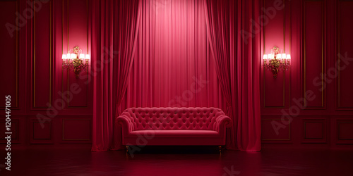 Crimson velvet sofa against dramatic red curtains in a luxurious room.
