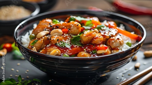 Crispy cashew Chicken stir fry with rice Asian take away food : Generative AI