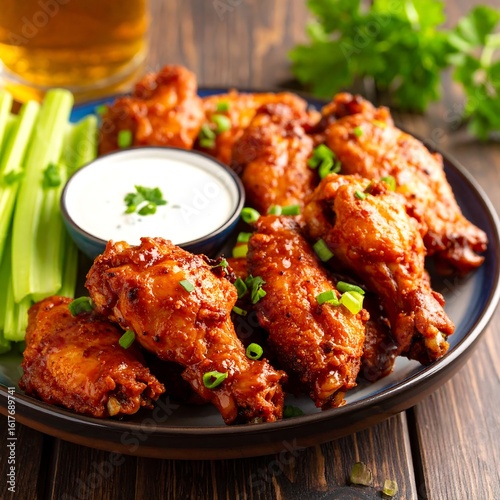 Crispy chicken wings, a creamy dip, and celery
