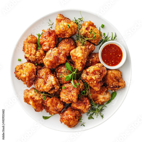 Crispy fried cauliflower bites served with spicy dipping sauce on a white plate