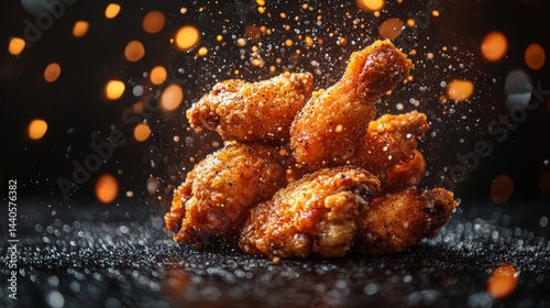Crispy fried chicken wings with seasoning explosion on dark background.