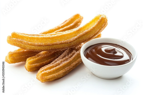 Crispy golden churros dusted with cinnamon sugar, accompanied by a small bowl of chocolate sauce