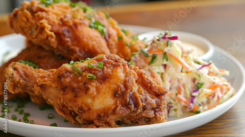 Crispy golden fried chicken with a side of coleslaw