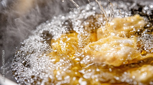 crispy golden wonton being fried in a traditional thai pan, corners crisping with delicate bubbles, oil is bubbling and foaming around folded edges, wrapper becoming translucent gold, steam carrying