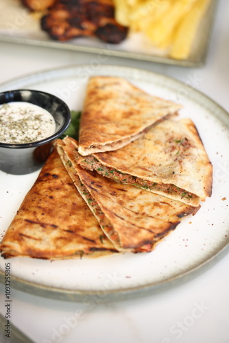 Crispy lahmacun slices filled with minced meat and herbs, served on a white plate with a side of dipping sauce, offering a savory treat.