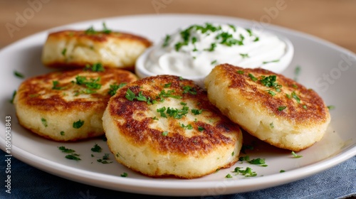 Crispy potato pancakes served with sour cream and lemon slices on white plate. Leftover Mashed Potato Pancakes, concept of rustic cuisine