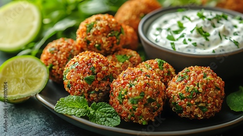 Crispy quinoa balls garnished with fresh herbs.