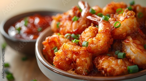 Crispy tempura shrimp, golden batter texture, scattered green onions, gradient pale yellow background, small bowl of vibrant red tomato sauce, food photography, macro details.