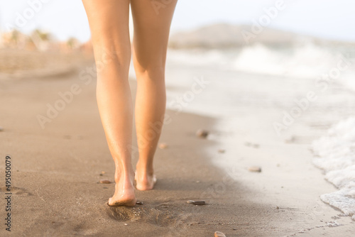 Crop woman walking on wet sand on seashore