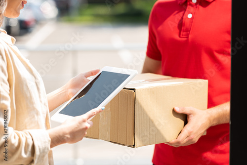 cropped view of delivery man holding box near woman with digital tablet