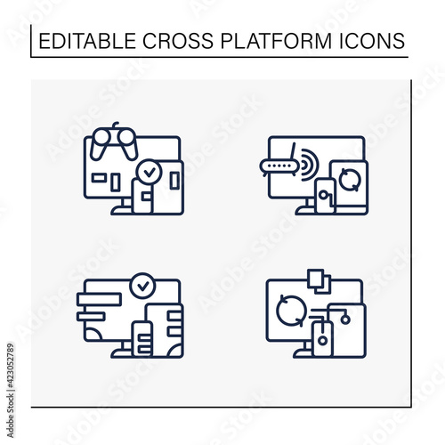 Cross platform line icons set. Programming environment. Playing, multiplayer, design, files syncing. Digitalization concept. Isolated vector illustration.Editable stroke