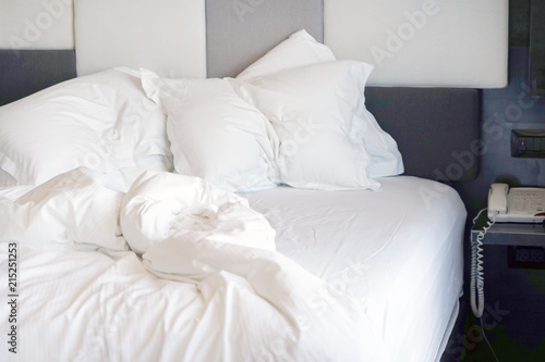 Crumpled bed in the hotel. Close-up of unfinished or messy bed after funny night, sex of new married couple. Dirty bed with decorate room. Used linens, bed sheet and pillows messed up.