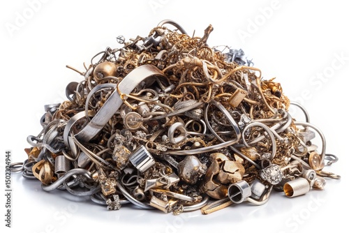 Crushed and compacted metal scrap heap isolated on a pure white background, featuring twisted and tangled metallic fragments in various shapes and sizes.