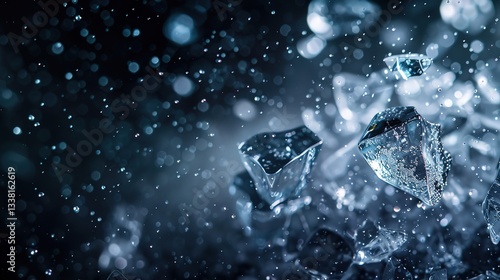Crushed ice scattered on dark background, frozen shards in motion, ice pieces dispersing, cold texture, detailed frosty fragments, abstract freeze
