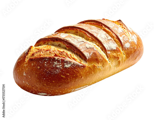 Crusty loaf of golden-brown bread, sliced top, isolated on a black background