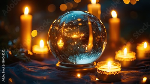 Crystal ball glowing with warm, swirling light surrounded by lit candles on a dimly lit surface. Mystical and magical atmosphere with soft, warm lighting and reflections. Generative AI