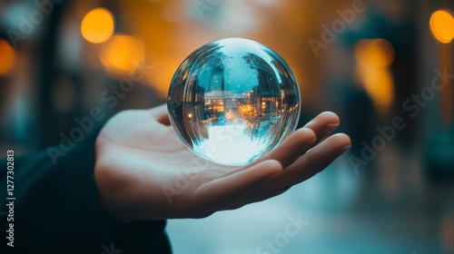 Crystal Sphere Reflection in Hand Over Blurred City Background