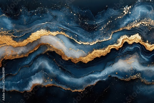 crystalline azure waves frozen in motion swirled with metallic gold ribbons and pearl essence creating an opulent marblelike surface with depth and dimension