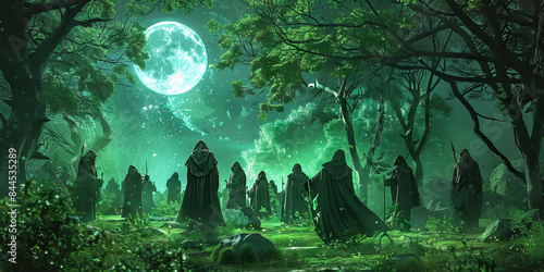 Cultists in the Grove: Cloaked Figures Performing Ancient Rituals Under Moonlight, Bathed in Emerald